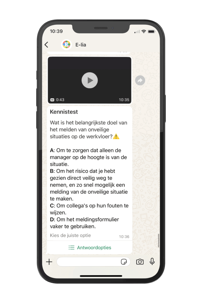E-lia facilita compartir reuniones de seguridad online de manera simple y efectiva. A través de WhatsApp, los empleados acceden directamente a información vital de seguridad sin necesidad de iniciar sesión o descargar aplicaciones adicionales, siempre, en cualquier lugar y en su propio idioma.